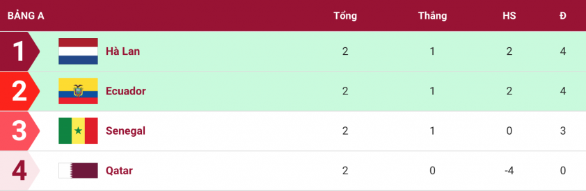 Sau 2 lượt trận, Qatar giành 0 điểm và đang đứng cuối bảng A. Như vậy, lượt trận còn lại của đội chủ nhà là mục tiêu giành điểm đầu tiên tại World Cup 2022 trước khi chính thức dừng cuộc chơi.