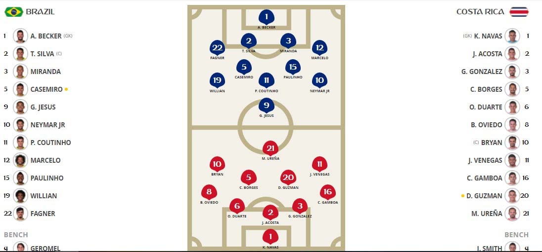 Đội hình ra sân chính thức Brazil vs Costa Rica